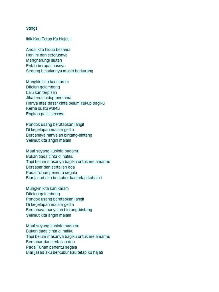 Lirik Lagu Kau Tetap Ku Hajati - Stings. Gm a am c a f am dm andai kita hidup besama g c e hari ini dan seterusnya am dm sedangkan kita sama g c g belum cukup betah am dm mengharungi lautan g c e entah berapa luasnya am dm sedang bekalannya g c g masih berkurang am dm mungkin kita kan karam g e ditelan gelombang am dm lalu kan terpisah g c e jika terus hidup bersama am dm hanya. Seluruh hidupku biar ku tetap cinta dan ku tetap setia untuk slama-lamanya.